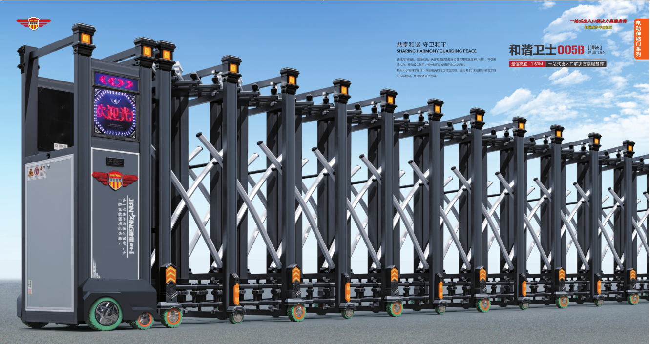 電動(dòng)伸縮門主要由門體、驅(qū)動(dòng)器、控制系統(tǒng)構(gòu)成。伸縮門的門體采用優(yōu)質(zhì)鋁合金及普通方管管材制作,采用平行四邊形原理鉸接,伸縮靈活行程大。伸縮門的驅(qū)動(dòng)器采用特種電機(jī)驅(qū)動(dòng),蝸桿蝸輪減速,并沒有手動(dòng)離合器,停電時(shí)可手動(dòng)啟閉,伸縮門的控制系統(tǒng)有控制板,按鈕開關(guān),另可根據(jù)用戶需求配備無線遙控裝置。特點(diǎn):1、電動(dòng)伸縮門的智能紅外探頭防撞裝置,遇人或異物30-50cm,可自行返回運(yùn)行,從而保障車輛及行人的安全。2、電